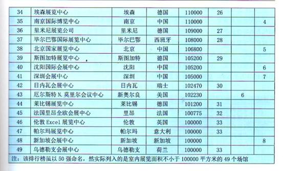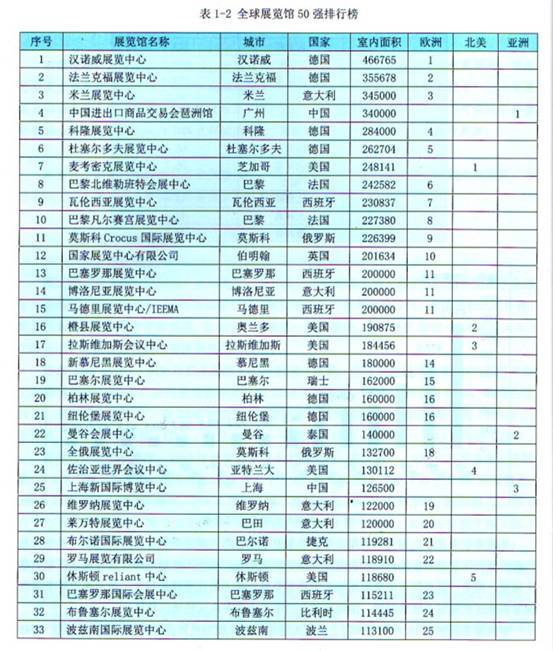 室內(nèi)展覽面積在10萬平方米以上的特大場館,已經(jīng)成為世界會展國力的標(biāo)志。根據(jù)A UMA數(shù)據(jù),2 011年室內(nèi)展覽面積1 0萬平方米以上的特大型場館,即最具競爭力的全球展館50強(實際列入的展館為49個)中,新增了沈陽國際展覽中心和倫敦艾克塞爾展覽中心,展館面積總計達(dá)到820.53萬平方米,主要分布在全球46個城市。其中,歐洲35個展館,分布在11個國家;亞洲8個展館,分布在中國、新加坡和泰國;北美6個展館,全部在美國。