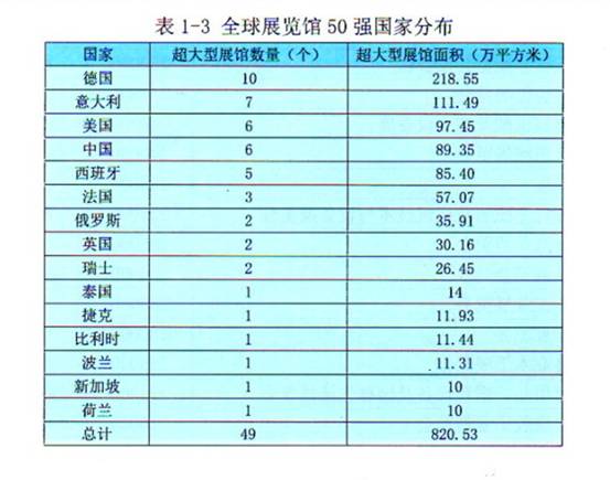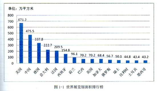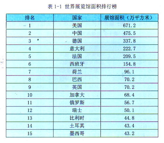 以展館面積大小排序,2013年世界展覽館十大國家為:美國第一,671. 2萬平方米;中國第二,475.5萬平方米;德國第三,337 .8 萬平方米;意大利第四,222.7萬平方米:法國第五,209. 5萬平方米:西班牙第六154.8萬平方米;荷蘭第七,.96 .1萬平方米;巴西第八.70. 2萬平方米;英國第九.70 .2萬平方米;加拿大第十,68.4萬平方米。其他還有俄歲斯(56. 7萬平方米)、瑞士(50.1萬平方米)、比利時(44. 8萬平方米)、土耳其(43.4萬平方米)、墨兩哥(43 2萬平方米),這15個國家的展館占全球展覽面積的80%。其中,美國、中國、德國、意大利和法國,這前五強國家的展館面積更是達(dá)到全球60%以上。