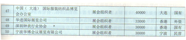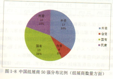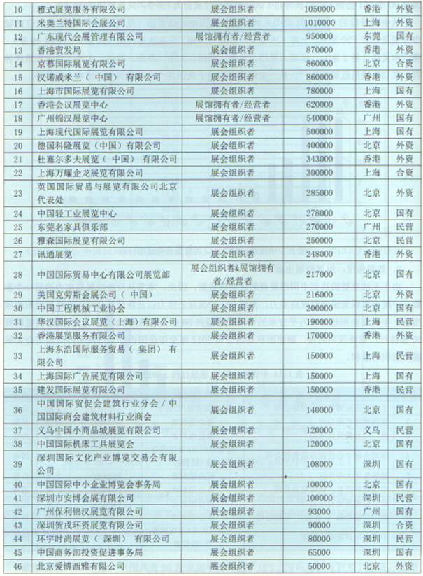 在中國組展商50強(qiáng)中,全年展會(huì)展出面積超過100萬平方米的大型組展商有11家,他們分別是上海新國際博覽中心有限公司、亞洲博聞?dòng)邢薰?、澳門貿(mào)易投資促進(jìn)局、深圳會(huì)展中心管理有限責(zé)任公司、勵(lì)展集團(tuán)大中華區(qū)、中國對(duì)外貿(mào)易廣州展覽總公司、北京振威展覽有限公司、法蘭克福展覽(香港)有限公司,中國國際展覽中心集團(tuán)、雅式展覽服務(wù)有限公司、米奧蘭特國際會(huì)展公司。其中上海新國際博覽中心有限公司為中德合資企業(yè),幾時(shí)展館擁有者,又是展會(huì)組織者;勵(lì)展集團(tuán)大中華區(qū)、亞洲博聞、法蘭克福(香港)、米奧蘭特軍事外資會(huì)展公司;深圳會(huì)展中心管理有限責(zé)任公司、中國對(duì)外貿(mào)易廣州展覽總公司、中國國際展覽中心集團(tuán)為國有企業(yè);雅式展覽服務(wù)有限公司、澳門貿(mào)易投資促進(jìn)局是澳門企業(yè)、只有北京振威是民營企業(yè)??梢姡覈駹I展覽企業(yè)實(shí)力堪憂,