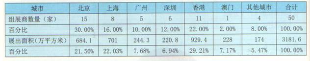 在組展商數(shù)量上,億北京、香港和上海的組展商實(shí)力最強(qiáng)。在50強(qiáng)中,北京占據(jù)15家,占比30%,排名第一;香港11家,占比22%,排名第二;上海8家占比16%,位列第三;第四是深圳,有6家,占比12%廣州第五,有5家,占比10%,澳門1家,占比2%,、其他省市(大連、東莞、寧波、義烏)共4家,占比8%。從比例上看,香港與北上廣深占據(jù)絕對(duì)優(yōu)勢(shì),絕大多數(shù)的組展商都集中在這幾個(gè)中國最發(fā)達(dá)的城市。