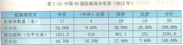 對(duì)上表數(shù)據(jù)進(jìn)行挖掘整理得到表1-15,則能夠更加清晰地看到中國本土組展商(包括國有和民營)與外資組展商之間的差距。