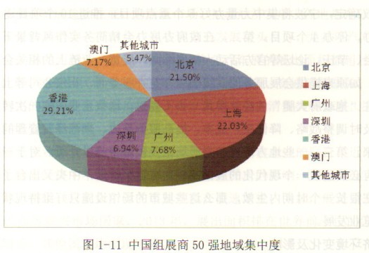 在展出面價(jià)方面,香港年組展面積打929.4平方米,29.21%,位居第一;上海第二,組展面積701萬平方米/年;占比22.03%,北京第三,684.1萬平方米/年,占比21.50%;第四是澳門,288萬平方米/年,占比7.17%;第五是廣州,244.3萬平方米、年,占比7.68%;深圳220.8萬平方米/年,分別為220.8萬平方米/年,占比6.94%;其他城市(大連、東莞、寧波、義烏)則總共展出174萬平法米,占比5.47%可以看出,香港、上海、北京三個(gè)城市的展出面積就占了總展出面積的60以上,可見地域集中度已經(jīng)相當(dāng)高。
