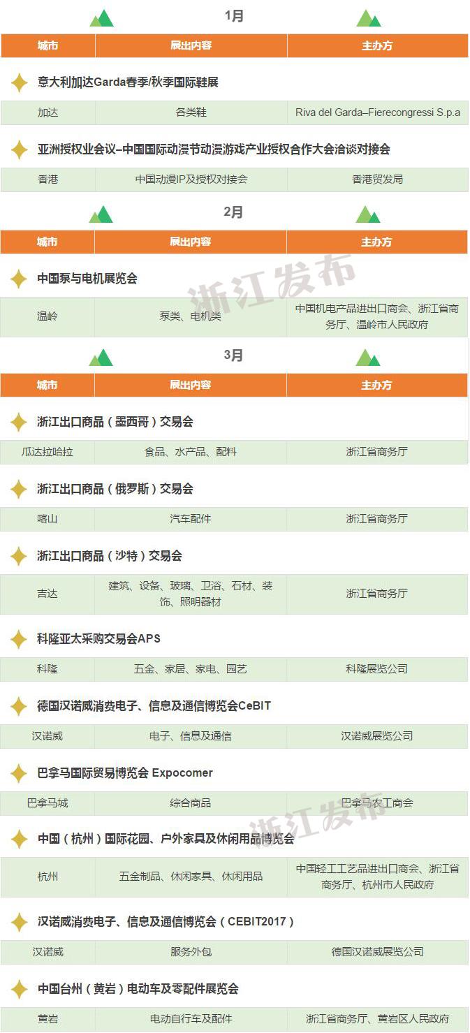 2017年,浙江將重點(diǎn)舉辦和支持96個(gè)展會(huì),其中自辦類貨物貿(mào)易展會(huì)12個(gè),自辦類服務(wù)貿(mào)易展會(huì)5個(gè),境外政策性重點(diǎn)展17個(gè),境內(nèi)政策性重點(diǎn)展11個(gè),其他類重點(diǎn)展36個(gè),商貿(mào)流通展會(huì)15個(gè)!