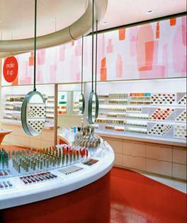 此外,由于化妝品主要在商場進(jìn)行銷售,在設(shè)計時容易遇到柱子的問題,這需要設(shè)計師進(jìn)行靈活處理。例如有一種中島型賣場,兩個品牌的中間由墻隔斷。假如隔斷墻的高度在1.5米,通透性通常會比較好,兩個品牌的形象都能夠充沛地展現(xiàn)出來。但要留意,這種做法的前提條件是,左邊是一根柱子,右邊是兩根柱子,最多不能超越三根柱子,這樣,顧客能夠在中島里自在穿行。但通常會遇到以四根柱子為中心的賣場,在這種狀況下,上述辦法就不適用了,而是應(yīng)該在中島的中間再開拓一條通道。這樣雖然使銷售面積減少一些,但是賣場的效率會大幅度提升,并且顧客能夠接近商品,從而增加商品銷售出去的機會。