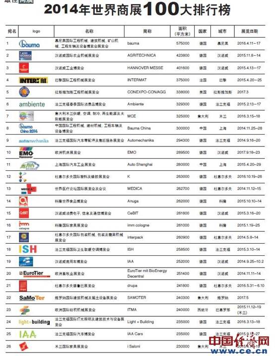 5. 世界商展100大排行榜由進(jìn)出口經(jīng)理人雜志社獨(dú)立研究發(fā)布,于2008年首次推出,每年7月發(fā)布,2014年是第7次推出這一榜單。