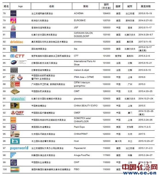 前不久,由《進(jìn)出口經(jīng)理人》雜志社主辦的2014進(jìn)出口經(jīng)理人年會(huì)暨中國外貿(mào)市場(chǎng)報(bào)告發(fā)布會(huì)在京舉行。會(huì)上發(fā)布了2014年世界商展100大排行榜,榜單顯示,100大中的中國展覽平均面積均低于平均面積,但發(fā)展迅猛,這顯示出雖然中國展覽還遠(yuǎn)未占據(jù)主導(dǎo)地位,但擴(kuò)張迅速,為全球商展發(fā)展貢獻(xiàn)強(qiáng)勁動(dòng)力?,F(xiàn)在,畢加展覽小編就跟大家聊一聊,我們先看這份排名: