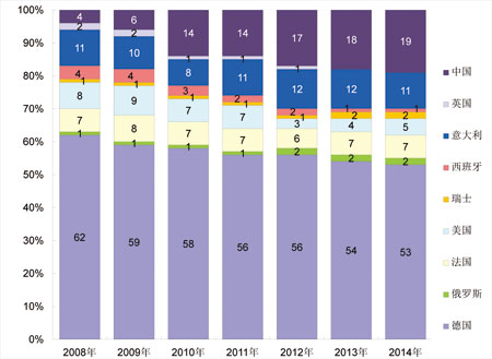 通過新榜單我們不難發(fā)現(xiàn),各展覽大國仍堅(jiān)守著各自的份額。榜單變化不大,相對(duì)增長緩慢,中國展覽份額正穩(wěn)步上升,2008年中國在100大排行榜中僅占4席,到2014年達(dá)到19席,成為世界商展的主要舉辦國。面對(duì)這樣的局面,德國展覽公司并不著急,德國的同行早已先行一步,開啟了全球辦展的步伐,并取得了積極成就,在中國的大型展覽中,有一部分正是德國展覽在中國的子展,見圖3。