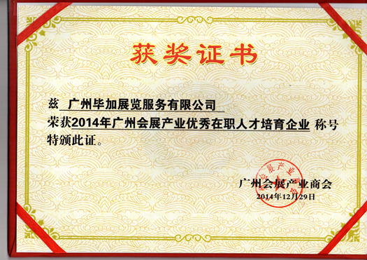 今日,畢加展覽參加了2015廣州會展產(chǎn)業(yè)商會年會,并榮獲2014年廣州會展產(chǎn)業(yè)優(yōu)秀在職人才培訓(xùn)企業(yè)的稱號,這次獲獎我們得到了肯定,使我們充滿力量,今后我們將不斷努力,秉承“敢做、敢當、求新、求發(fā)展”的理念做好每一個展臺設(shè)計,培養(yǎng)更多的展會人才。