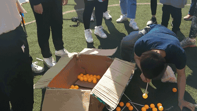 吸管運(yùn)球(用吸管吸住5個(gè)乒乓球投進(jìn)箱子里)