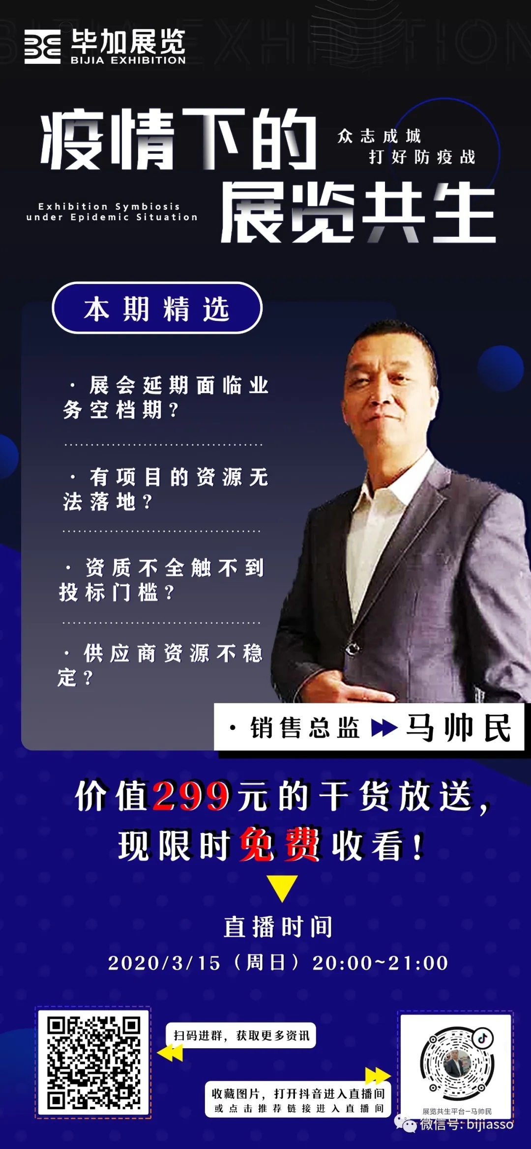 此次畢加集團(tuán)派出銷售總監(jiān)馬帥民馬總為大家講解——“疫情下的展覽共生”主題直播。