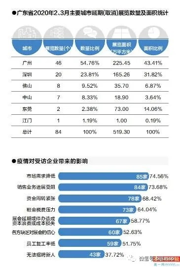 廣東會展組展企業(yè)協(xié)會對會員的問卷調(diào)查顯示,截至3月底,省內(nèi)已經(jīng)有不少于100個展會確定取消和延期,現(xiàn)在2月和3月的肯定都取消或者延期了,而4月和5月的情況還不明朗,上述數(shù)字還可能繼續(xù)增加。目前廣州的一些行業(yè)品牌大展如廣州美博會、廣州婚博會等已經(jīng)明確全部延期,深圳的傳統(tǒng)大展如深圳機械展、深圳珠寶展等也一樣被迫推后。
