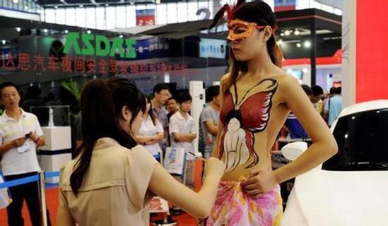 在展臺內(nèi),一位藝術(shù)家在美女裸體現(xiàn)場進(jìn)行彩繪。其彩繪時(shí)間之長暫且不表,只知旁邊的窗戶外一直駐足了不少看客。那人體模特時(shí)不時(shí)還要接受電視臺的拍攝要求,站起來擺個(gè)姿勢,接著繼續(xù)接受彩繪,你說這人氣能不旺嗎?